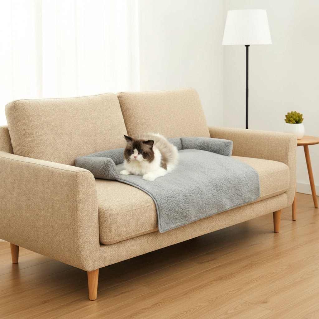 Det indbyggede ryglæn giver ekstra støtte og tryghed, mens den skridsikre underside sikrer, at tæppet bliver på plads – selv når dit kæledyr hopper op med fuld energi.